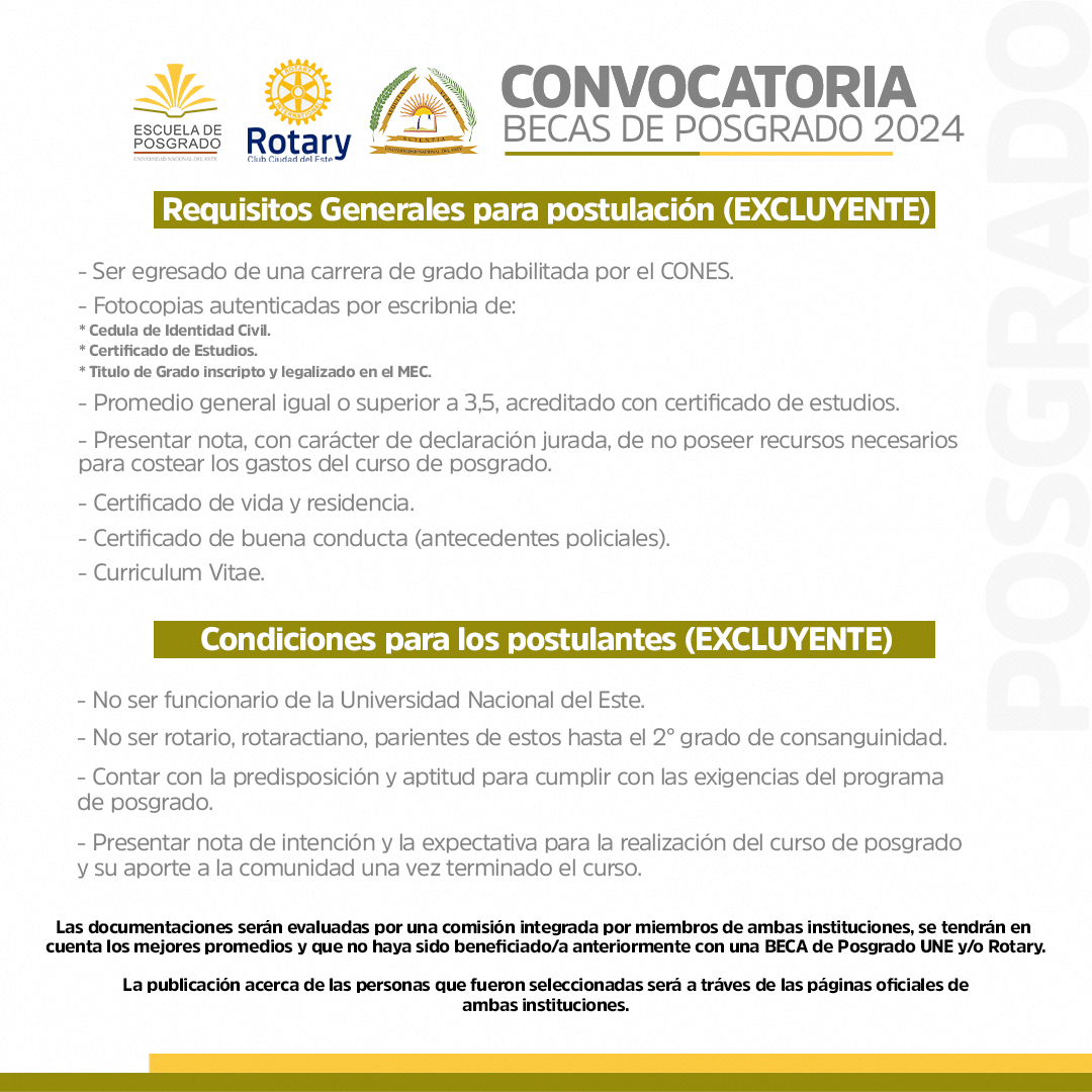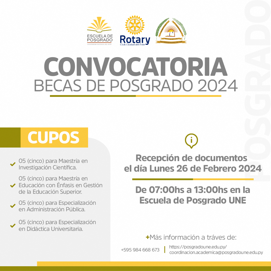 La Escuela de Posgrado de la Universidad Nacional del Este, en alianza estratégica con el Rotary Club Ciudad del Este, se complace en anunciar la apertura de la convocatoria para el programa de Becas de Posgrado 2024. Esta iniciativa busca impulsar la excelencia académica y profesional de graduados que demuestren un compromiso firme con el desarrollo y la innovación en sus campos de estudio.
